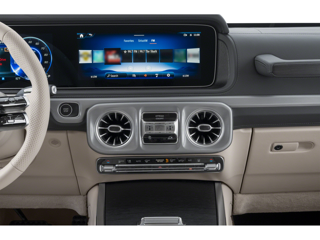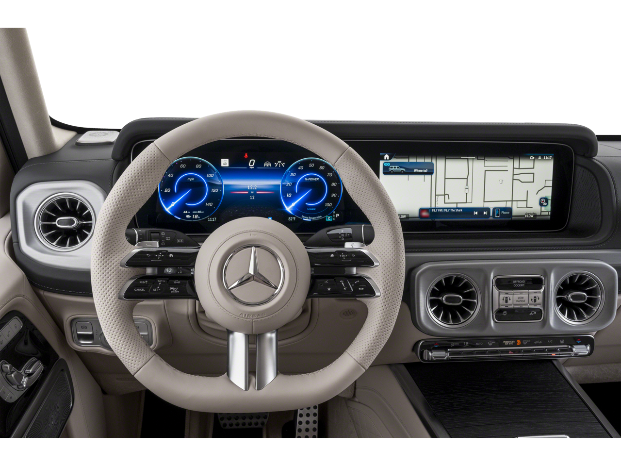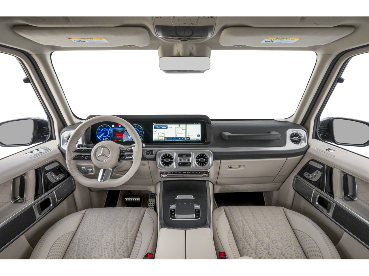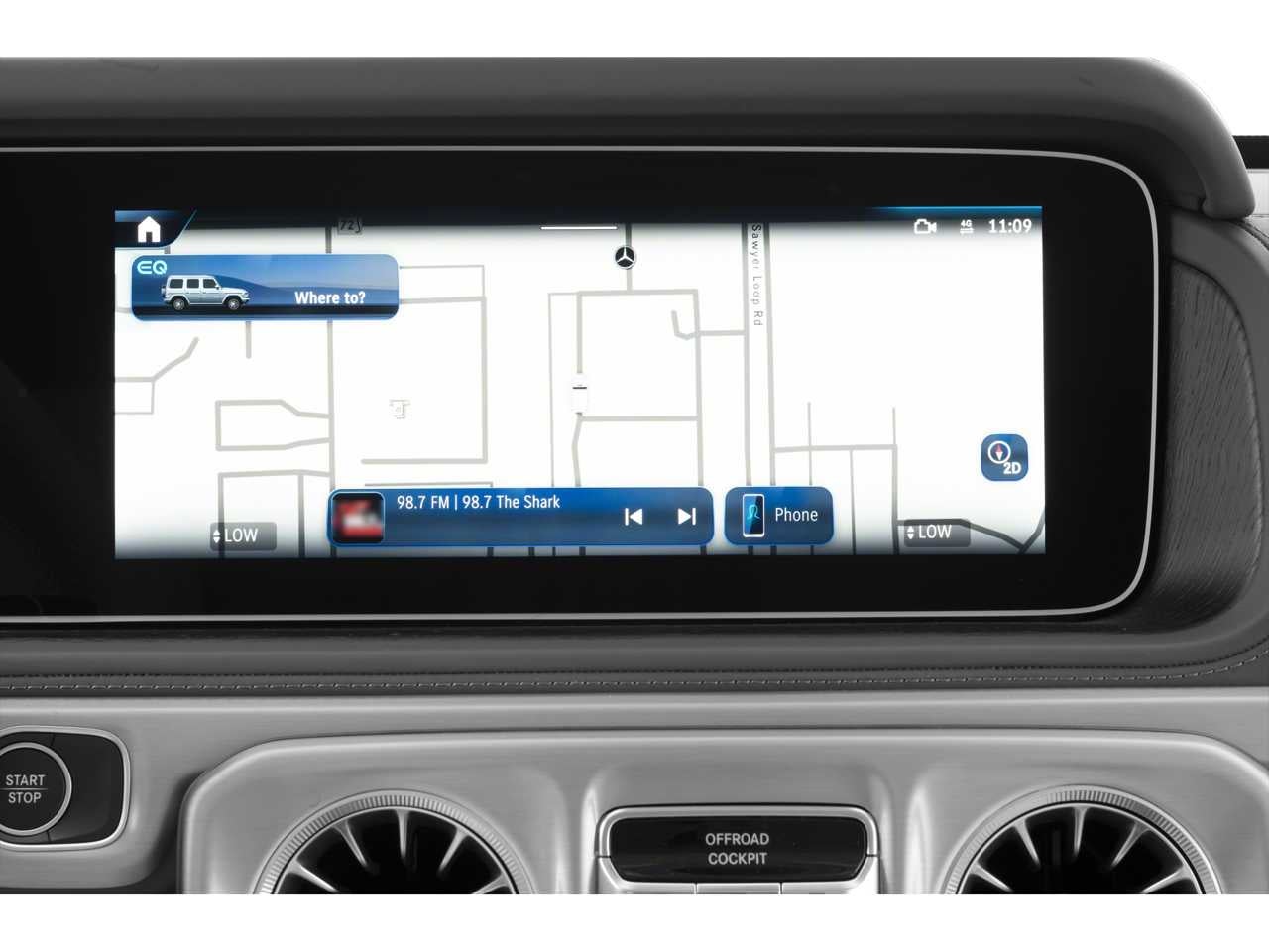 Leather Seats, Navigation, Sunroof, Full-Time All-Wheel, Rear Air, Heated Driver Seat, Heated Rear Seat, Cooled Driver Seat, Back-Up Camera, Running Boards, Premium Sound System, Satellite Radio, iPod/MP3 Input, Onboard Communications System, Aluminum Wheels. MP3 Player, Privacy Glass, Keyless Entry, Steering Wheel Controls, Child Safety Locks. Mercedes-Benz G 580e with MANUFAKTUR Moonlight White Metallic exterior and Silver Pearl/Black interior features a Electric Motor.